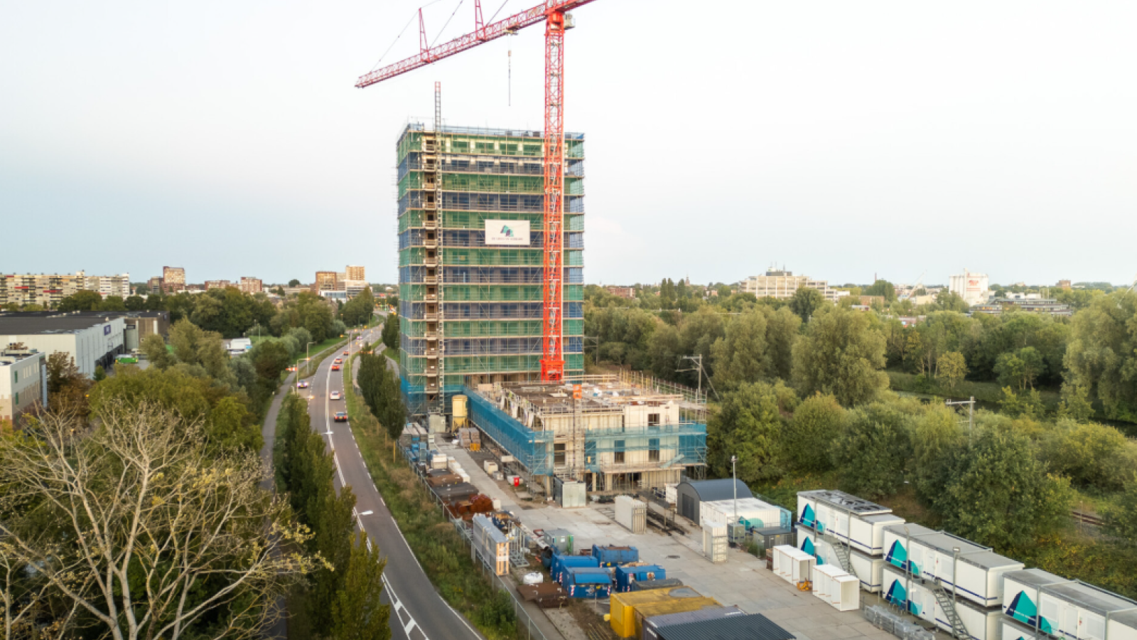 Ondertussen staat het casco van de lage toren helemaal en wordt daar volop gemetseld. Op het dak van de hoge toren is zelfs al de installatie geplaatst die straks voor de warmte zorgt — weer een stap dichter bij een duurzaam en comfortabel gebouw!